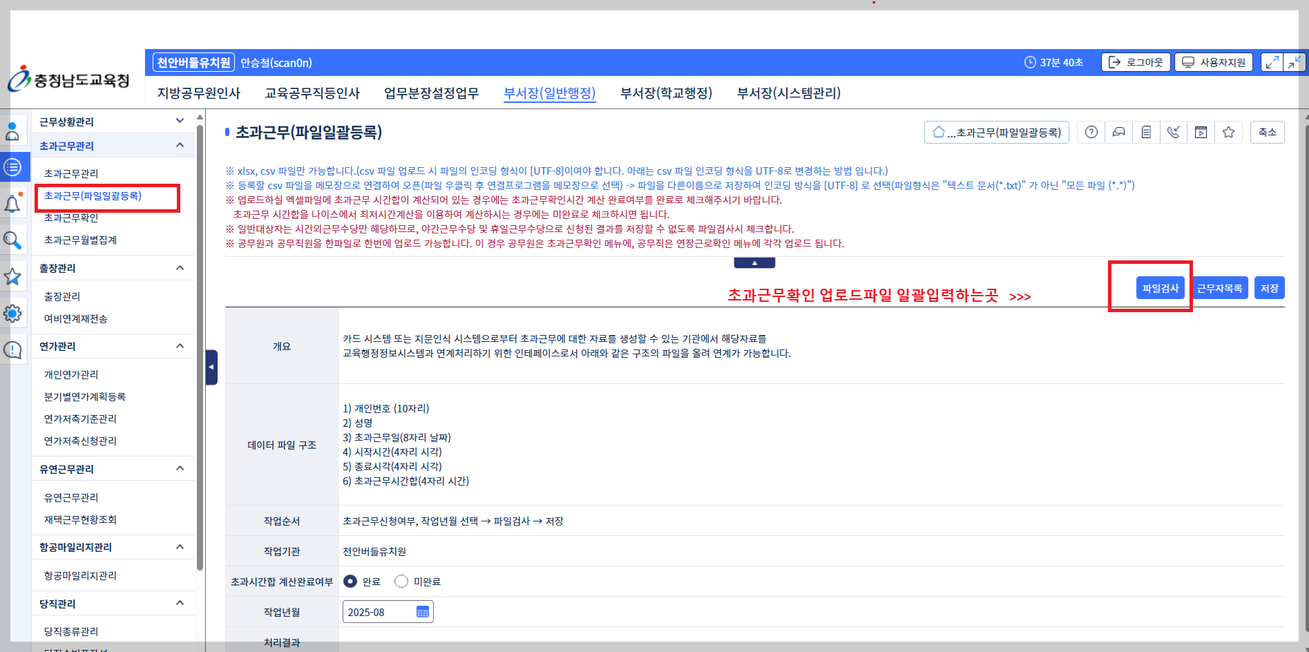 메뉴위치) 나이스-복무-초과근무관리-초과근무(파일일괄등록) -파일검사 버튼클릭