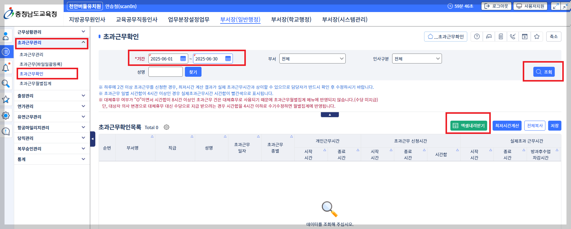 메뉴위치) 나이스-복무-초과근무관리-초과근무확인 -엑셀내려받기