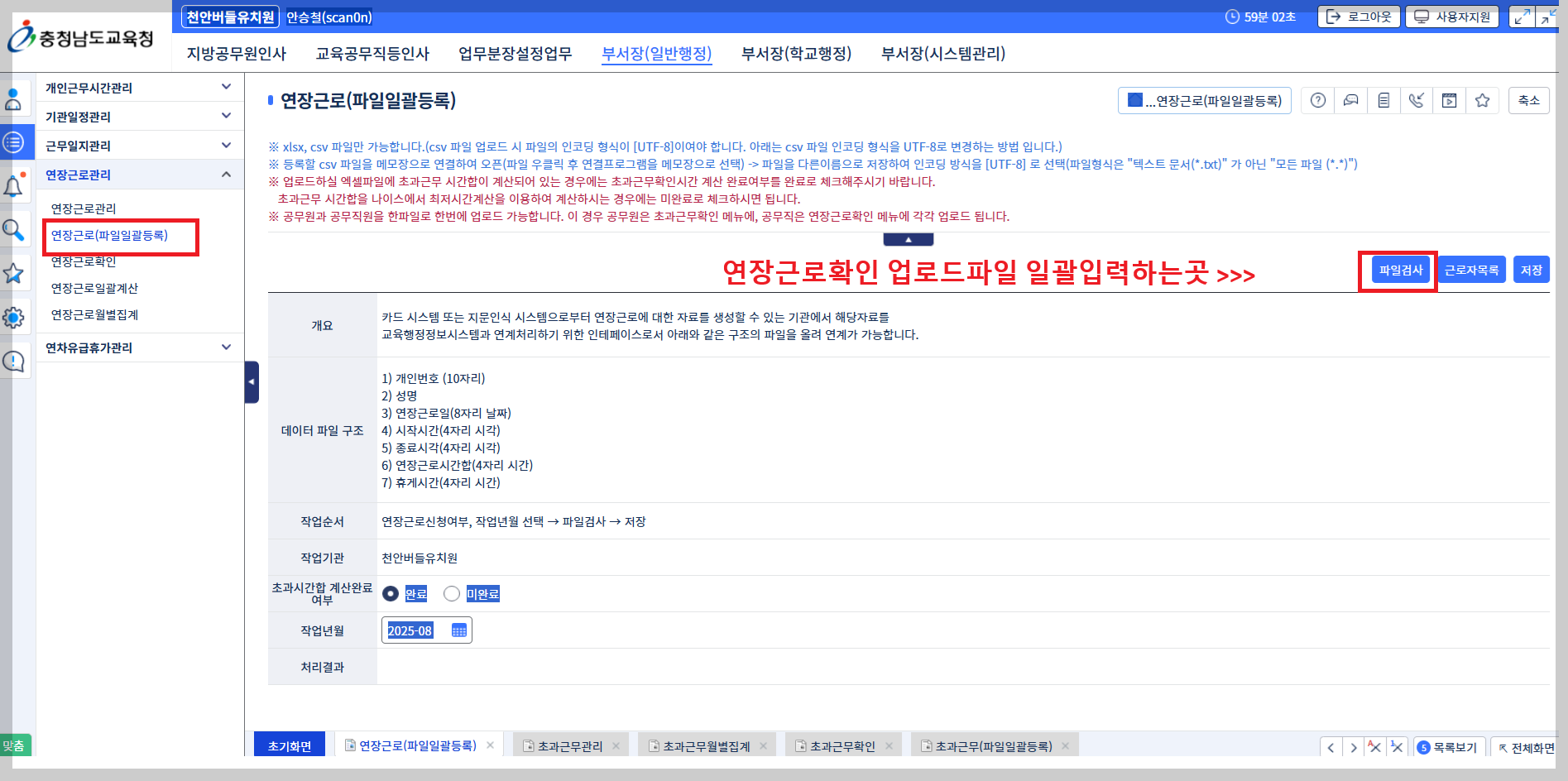 나. 교육공무직 연장근로무 자동계산파일 업로드 하는곳
