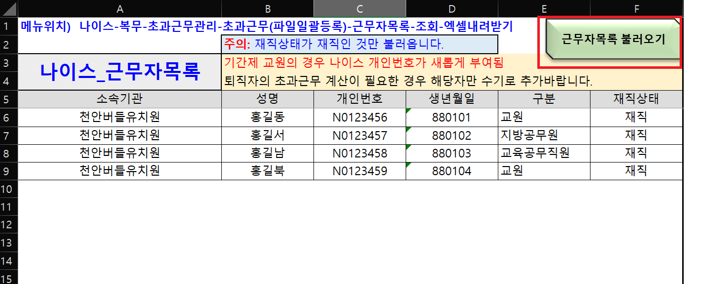 | F | 재직상태 | 수기 | 재직, 퇴직, 결원 중 선택 입력 | |